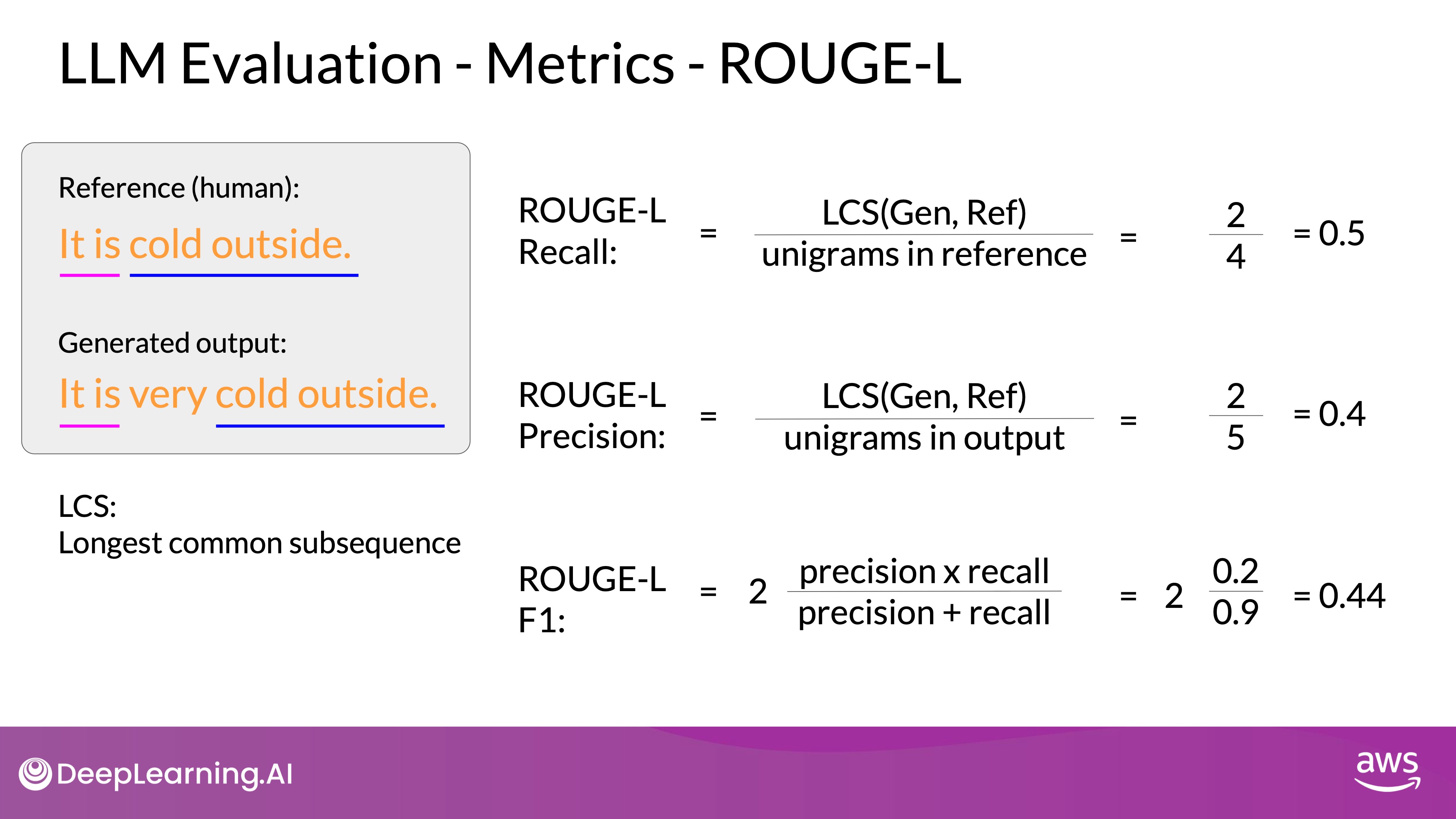 However, you'll still be challenged if their generated words are all present, but just in a different order. For example, with this generated sentence, outside cold it is. This sentence was called perfectly even on the modified precision with the clipping function as all of the words and the generated output are present in the reference. Whilst using a different rouge score can help experimenting with a n-gram size that will calculate the most useful score will be dependent on the sentence, the sentence size, and your use case.