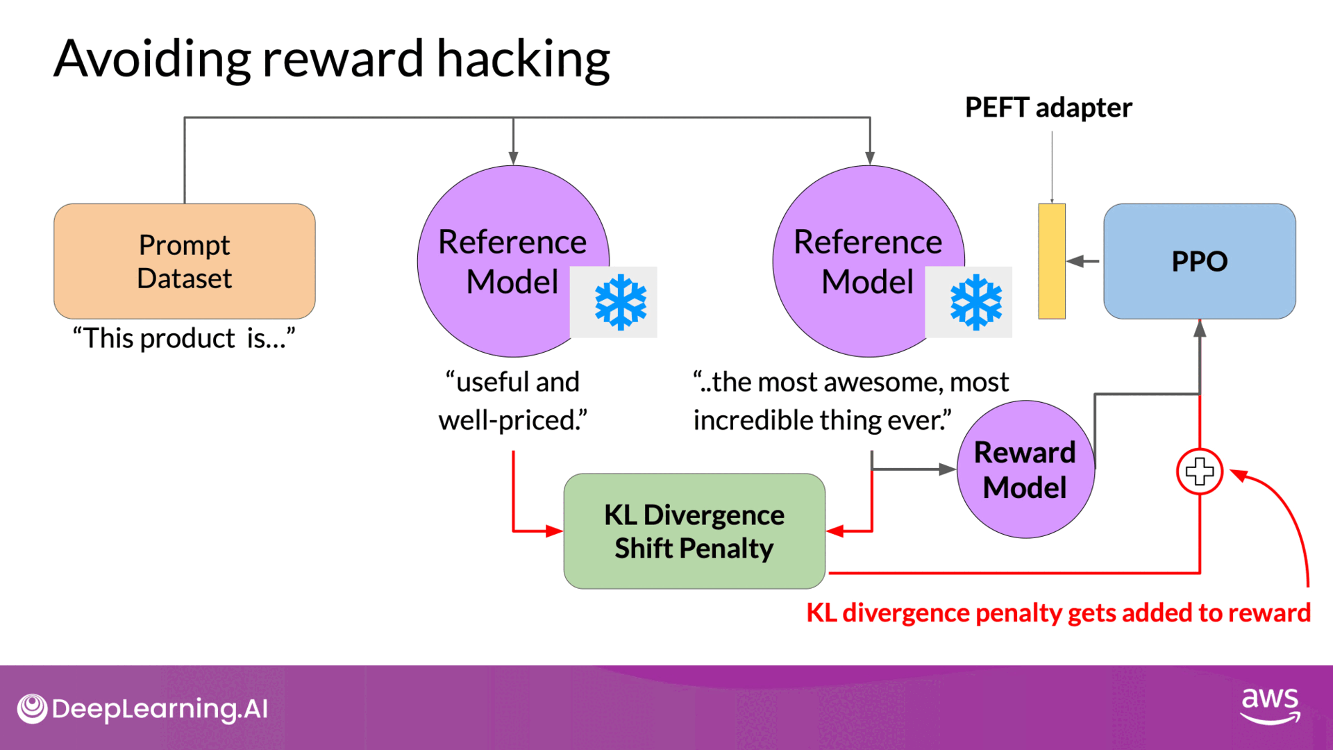 Note that you now need two full copies of the LLM to calculate the KL divergence, the frozen reference LLM, and the oral updated PPO LLM. This is still a relatively compute expensive process. To reduce the computational load, Parameter-Efficient Fine-Tuning (PEFT) can be used: