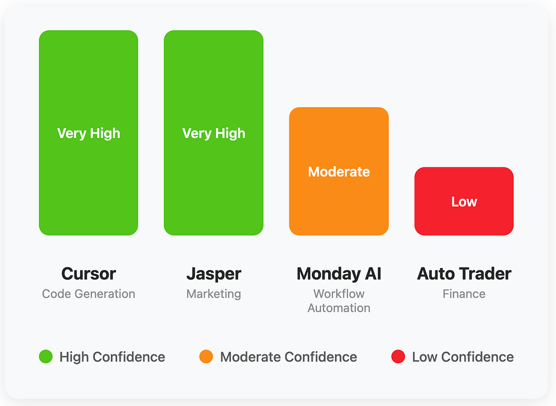 - Example: Coding assistants like Cursor or GitHub Copilot. Even if suggestions are sometimes wrong, developers can instantly see, edit, or roll back changes. The risks are limited (compile errors, minor bugs), correction is cheap (simple edits), and the value is high (time saved, creative input). This balance explains their rapid adoption.